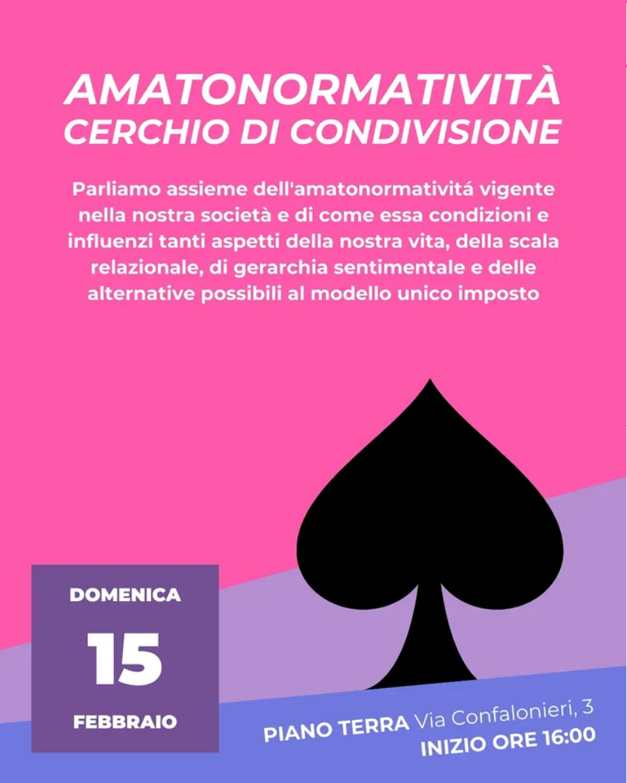 In occasione dell’Aromantic Spectrum Awareness Week abbiamo deciso di organizzare un cerchio di condivisione per parlare assieme dell’amatonormativitá vigente nella nostra società e di come essa condizioni e influenzi tanti aspetti della nostra vita.